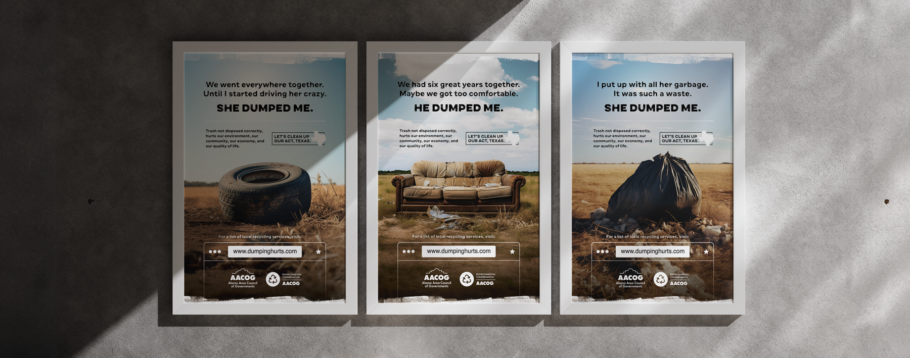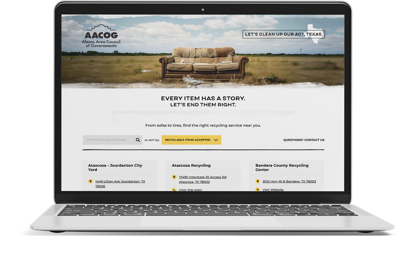 The Alamo Area Council of Governments enlisted Legacy79 to address illegal dumping in Bexar, Kendall, and Medina counties. The “Dumping Hurts” campaign aimed to reduce illegal dumping by educating the community on proper waste disposal and encouraging the reporting of such activities. Through engaging visuals, a dedicated website, and emotionally resonant messaging, Legacy79 is helping raise awareness, fostering environmental stewardship in the targeted areas.